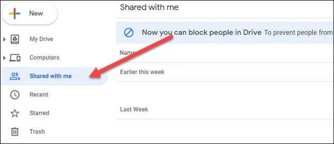 Google Drive hesabınıza paylaşılan her şey, uygun olarak "benimle paylaşılan" sekmesinde bulunabilir. Bu, sizin için istenmeyen şeyleri gönderen insanları engelleyebileceğimiz yerdir. Başını aşmak drive.google.com Bir Web tarayıcısında ve sekmeyi bulun.