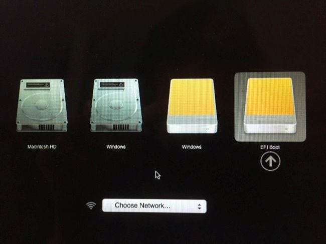 Sürücüyü gerçekten başlatmak için Mac'inizi yeniden başlatın ve önyükleme sırasında Option tuşunu basılı tutun . Önyükleme seçenekleri menüsünün göründüğünü göreceksiniz. Bağlı USB sürücüsünü seçin. Mac, Linux sistemini bağlı USB sürücüsünden başlatacaktır.