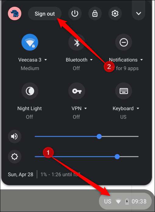 Konuk hesabına girmeden önce oturumu kapatmanız gerekir, bu nedenle Chromebook'ta oturum açtıysanız, sistem tepsisindeki saati ve ardından "Oturumu Kapat" ı tıklayın.