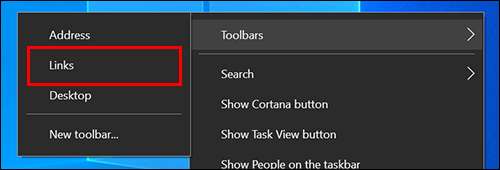 Sonra, görev çubuğuna tekrar sağ tıklayın, fare imlecinizi "araç çubukları" seçeneğinin üzerine getirin ve "Bağlantılar" seçeneğini seçin. Seçildikten sonra yanında bir onay işareti görünecektir.