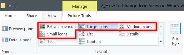 Dosya Gezgini, simge boyutlarını ekstra büyük, büyük, orta veya küçük olarak ayarlamanıza izin verir.