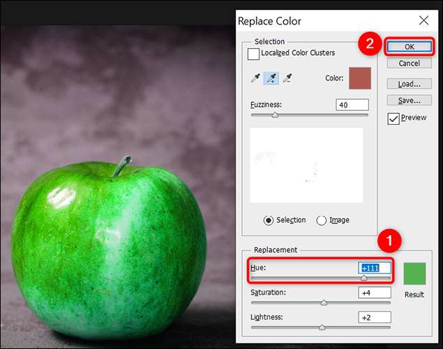 "Renk Değiştir" penceresine geri dönün, hedefinizi nesnenizdeki hedef rengi ayarlamak için "Hue" kaydırıcısını sürükleyin. Her şey iyi göründüğünde, "Renk Değiştir" penceresinde "Tamam" ı tıklayın.