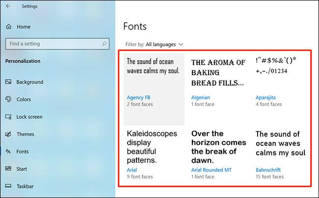 Ayarlar bölümünde, “Kişiselleştirme” öğesini sol kenar çubuğundan “Yazı Tipleri” seçeneğini tıklayın. Sağ bölmede görüntülendiğinde, varsayılan olarak ayarlamak ve yazı tipi adını tıklayın istediğiniz yazı tipini bulun.