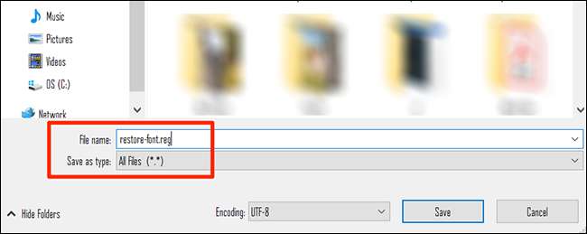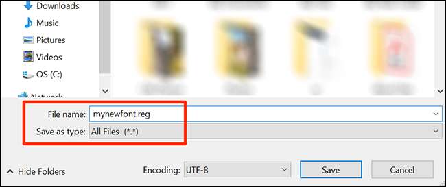 Not Defteri'nde, Dosya & gt; Farklı kaydet. Daha sonra “Dosya adı” alanında “.reg” izledi bir ad girin. Örneğin, “mynewfont” ise, “mynewfont.reg” yazarsınız olarak dosyayı kaydedin. “Kaydet türü olarak” açılan menüden “Tüm Dosyalar” ı seçin dosyanızı kaydedileceği konumu seçin ve tıklayın “Kaydet”.