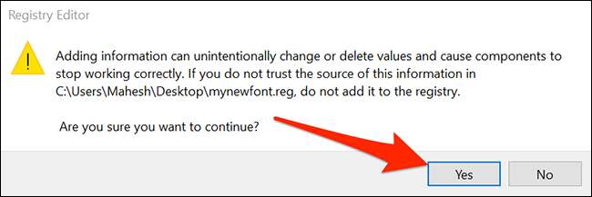 Varsayılan yazı tipini kayıt defterini eklemek için her iki zamanda Evet "i tıklayın.