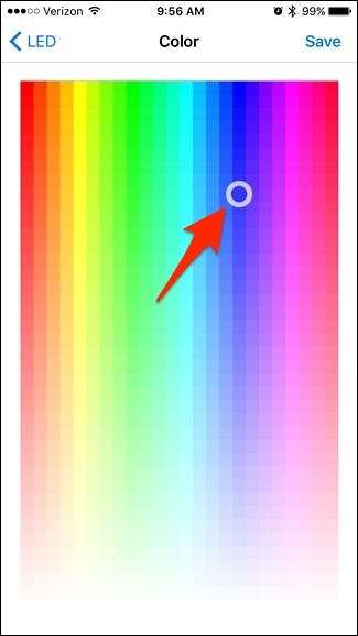 Yuvarlak noktayı renk paletinde herhangi bir yere taşıyarak hemen hemen istediğiniz herhangi bir rengi seçebilirsiniz. Maalesef, uygulamadaki rengi değiştirdikçe SkyBell kapı zili LED ışık rengini gerçek zamanlı olarak değiştirmeyecek.