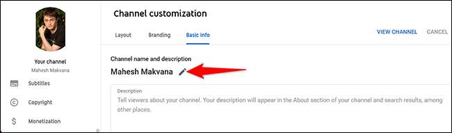Açılan "Temel Bilgi" bölümünde, geçerli kanal adınızın yanında, kalem simgesini tıklatın.
