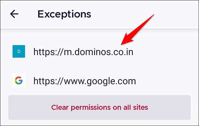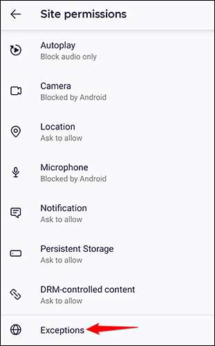 Şimdi "Site İzinleri" ekranında. Bu ekranın alt kısmında, "İstisnalar" üzerine dokunun.