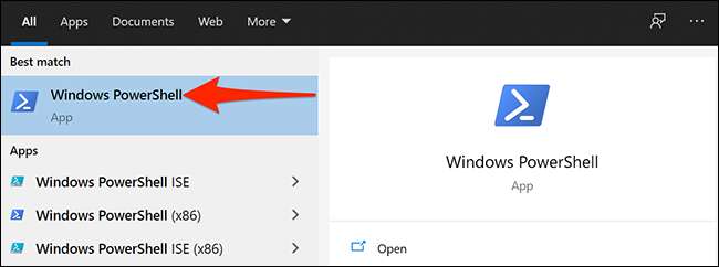 Ağınız için bu doğru cevabı almak için, "Başlat" menüsüne erişin, "Windows PowerShell'i" arayın ve sonuçlardaki PowerShell App kısayolunu tıklatın.