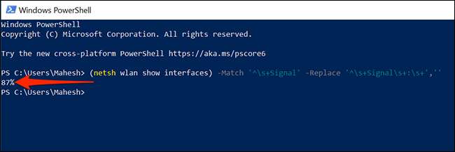 PowerShell, geçerli Wi-Fi sinyal gücünüzü yüzde formunda gösteren tek bir satır çıkışını görüntüler. Yüzde ne kadar yüksek olursa, sinyaliniz o kadar iyi olur.