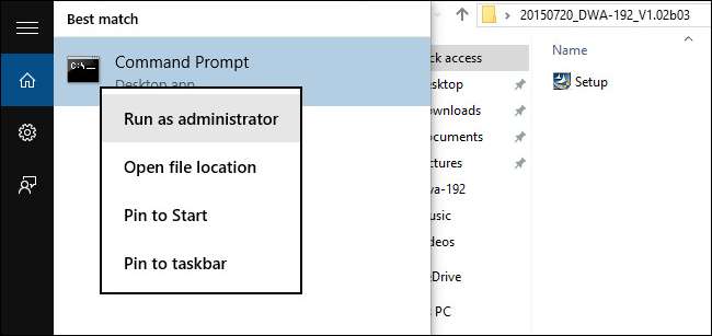 Söz konusu uygulamaya sağ tıklayıp "Yönetici olarak çalıştır" seçeneğinin seçilmesi hiçbir şey yapmasa da, Windows 10 Başlat Menüsündeki çalıştır iletişim kutusuna "cmd.exe" koyarsanız, üzerine sağ tıklayın ve "Farklı Çalıştır" öğesini seçin. yönetici "için Komut istemi , yukarıda sorun teşkil eden Setup.exe uygulamasıyla birlikte görüldüğü gibi, yükseltilmiş komut istemi, hatalı şekilde imzalanmış yürütülebilir dosyayı çalıştıracaktır.