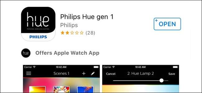 Devam edin ve indirin İOS için Philips Hue uygulaması veya Android . Kullanılabilir birçok üçüncü taraf Philips Hue uygulaması olduğunu unutmayın, bu nedenle bunun için resmi olanı indirdiğinizden emin olun - "Gen 2" değil "Gen 1" yazdığından emin olun.