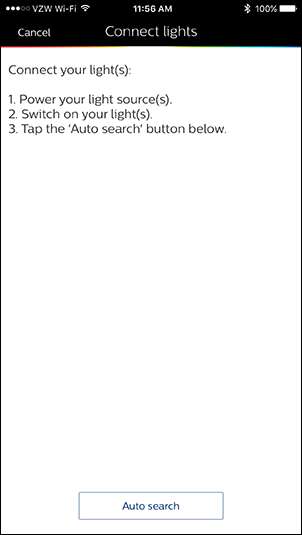 Ardından Philips Hue ampullerinizi Hue Bridge'e eklemenin zamanı geldi, bu nedenle eklemek istediğiniz ampullerin açık olduğundan emin olun ve ardından alttaki "Otomatik arama" ya dokunun.
