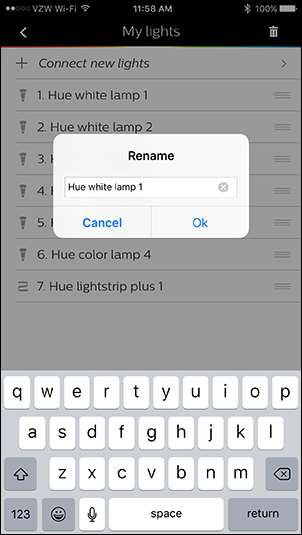 Ardından, tek bir ampule dokunabilir ve onu istediğiniz gibi yeniden adlandırabilirsiniz. Örneğin, oturma odası ampullerinize "Oturma Odası" adını verebilirsiniz. Bu özellikle Siri'yi kullandığınızda yararlıdır, çünkü ona ampulleri adlarıyla açıp kapatmasını söyleyebilirsiniz ("Hey Siri, Oturma Odası ışıklarını aç").