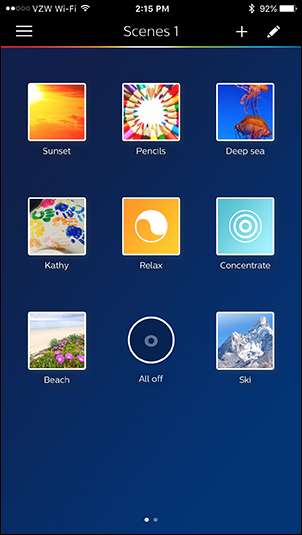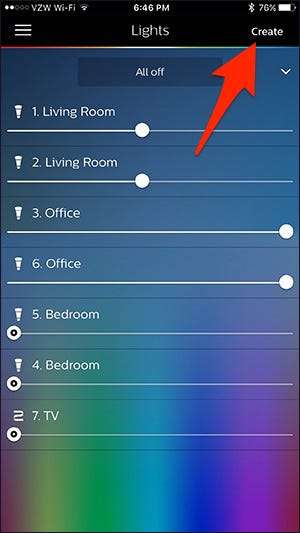 Bir sahne oluşturmak için sol üst köşedeki Menü düğmesine tıklayın ve "Işıklar" menüsüne geri dönün. Işıklarınızı, belirli renkler de dahil olmak üzere istediğiniz şekilde ayarlayın ve ardından sağ üst köşedeki "Oluştur" seçeneğine dokunun. (Android'de bu, "Oluştur" kelimesi yerine iki kareli bir simge olacaktır.)