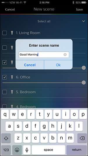 Sahneye bir ad verin ve "Tamam" ı tıklayın. Bu sahne artık "Sahneler" de görünecek ve sadece üzerine dokunarak hızlı bir şekilde etkinleştirilebilir.