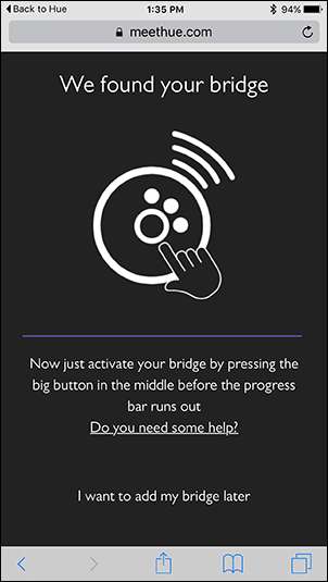 Ortada "Philips" yazısı bulunan cihazın üstündeki yuvarlak düğme olan Philips Hue Bridge üzerindeki Push-Link düğmesine basmanız istenecektir. Baştan başlamanız gerekmeden önce bu düğmeye basmanız için yaklaşık 30 saniyeniz vardır.