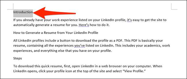 Belgenizi Microsoft Word ile açarak başlayın. Word penceresinde, belgenizde bir başlık seçin.