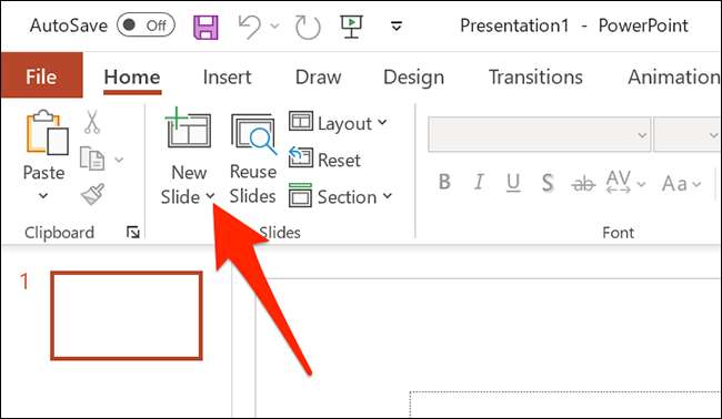 Açılan PowerPoint Düzenleme penceresinde, üstteki "HOME" sekmesini tıklayın. Ardından, üstteki "Slaytlar" bölümünde, "Yeni Slayt" yanında ok simgesini tıklatın.