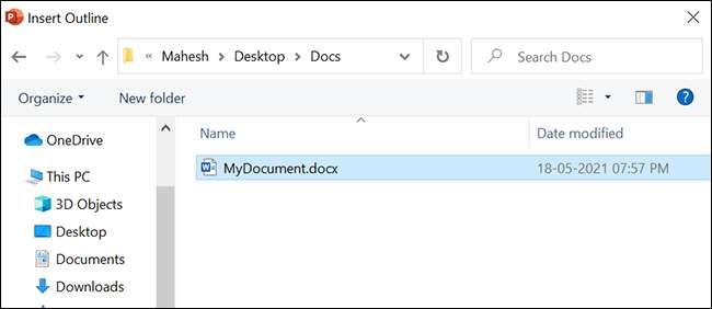 PowerPoint, sunumunuza içe aktarılacak dosyayı seçmenizi ister. Burada, daha önce biçimlendirdiğiniz Word belgesini seçin.