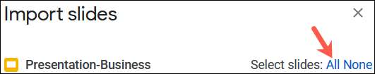İthalat Slaytları penceresi göründüğünde, Google Slaytlarında kullanmak istediğiniz her slayt'ı tıklatın. Hepsini kullanmak istiyorsanız, sağ üstteki Slaytlar seçeneğinin yanındaki "Hepsini" tıklatın.