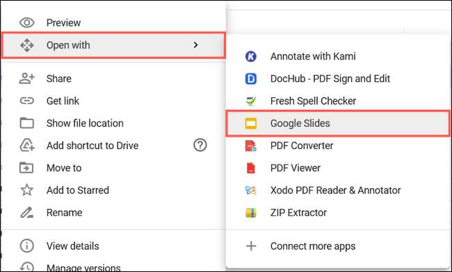 Dosya yüklendikten sonra Google Drive'a yüklendikten sonra, sağ tıklatın ve & GT ile Aç'ı seçin; Google Slaytları.