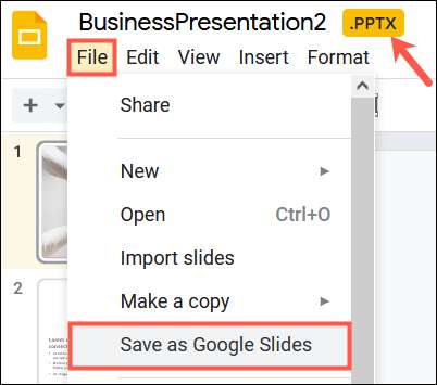 Dosya ve GT'ye tıklayın; Dönüştürmek için menüden Google Slaytlar olarak kaydedin.