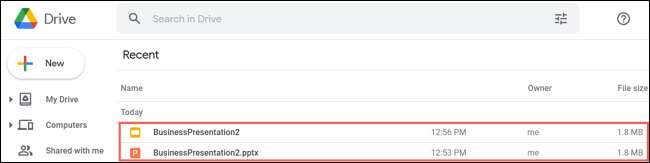 Bu, sunumunu bir Google Slayt dosyası olarak yeni bir sekmede açacaktır. Yukarıda açıklandığı gibi, yaptığınız değişiklikler otomatik olarak tasarruf edecek, ancak şimdi bir Google Slaytlar sunumu olarak. Ve her iki dosyayı Google sürücünüzde göreceksiniz.