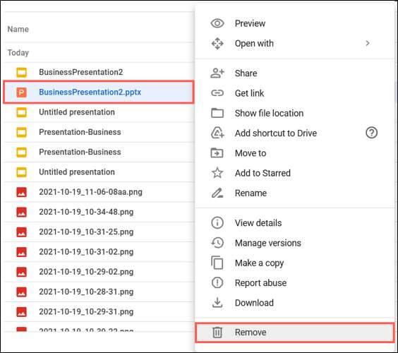 PowerPoint dosyasını dönüştürdükten sonra Google Drive'ınızdan kaldırmak istiyorsanız, sağ tıklayın ve "Kaldır" seçeneğini seçin.