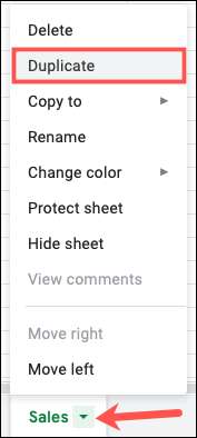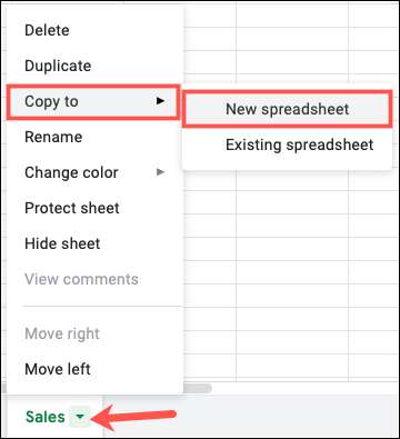 Kopyalamak istediğiniz sayfanın sekmesindeki oku tıklayın. İmlecinizi kopyalamak için hareket ettirin ve POP-OUT menüsünde "Yeni Elektronik Tablo" ı tıklayın.