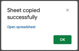 Bir dakika sonra, sayfanızın başarıyla kopyalandığı bir mesaj göreceksiniz. Doğrudan başlatmak için "Elektronik Tabloyu Aç" ı tıklatabilirsiniz veya daha sonra açmak için "Tamam".