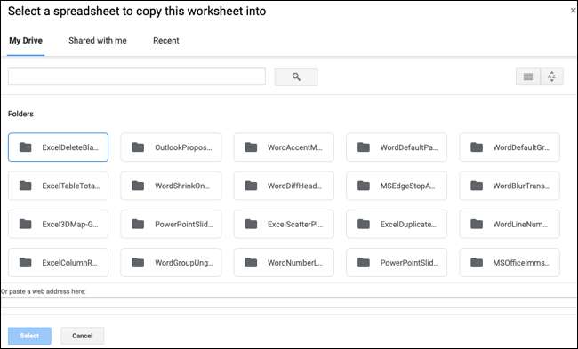 Sürücüm için üstteki sekmeleri kullanın, Benimle paylaştı veya sayfaya gitmek için sonlar. Ayrıca bulmak için Arama kutusunu da kullanabilirsiniz veya URL'yi alt kısımda yapıştırabilirsiniz. "Seç" ve sayfanın bir kopyası mevcut çalışma kitabına girecektir.