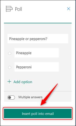 Birden fazla cevap için izin verebilseniz de, yalnızca bir soru sorabilirsiniz. Anket tamamlandığında, "Anketi E-postaya Ekle" düğmesini tıklayın.