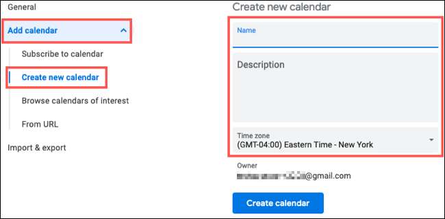 Solda, Genişlet Takvim Ekle ve "Yeni Takvim Oluştur" ı seçin.