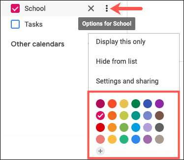 Takviminizi serin bir renk vermek için, seçenekleri açmak için sağdaki üç noktaya tıklayın. Özel bir renk eklemek için bir renk seçin veya artı işaretini tıklayın. Takviminiz için tüm olaylar, seçtiğiniz renge gösterecektir.