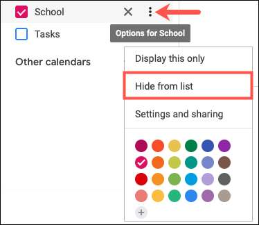 Bahsedildiği gibi, isterseniz listenizden bir takvimi gizleyebilirsiniz. Bu mevsimsel, okul veya spor takvimleri Tüm yıl boyunca kullanmıyorsun. Takvimin yanındaki üç noktaya tıklayın ve "Listeden gizleme" seçeneğini seçin.