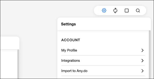 WhatsApp hizmetini etkinleştirmek için sından Any.Do web uygulaması . Sonra, bir açılır menü ortaya çıkarmak için sağ üst köşesindeki dişli simgesini tıklayın.
