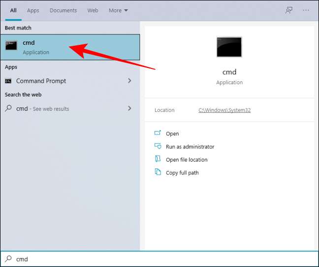 Görev çubuğundan Windows Başlat düğmesini tıklayın ve Windows Arama çubuğundaki "cmd" yazın Komut İstemi'ni açın. Ardından, arama sonuçlarından "Komut İstemi" i seçin.