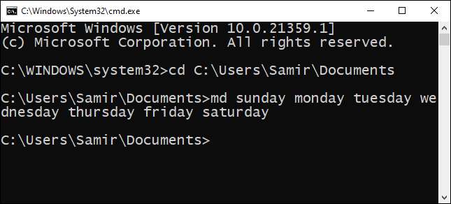 Küçük başlayalım ve bir hafta içinde her gün için yedi klasör oluşturmak istediğinizi söyleyelim. Böylece, aşağıdaki komutu kullanabilirsiniz: