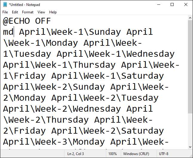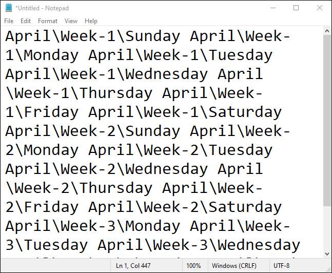Klasör ve alt klasör adlarını, not defteri gibi bir uygulamadaki düz metin dosyasında bir klasör yapısıyla yazın. Diyelim ki, haftalar ve her hafta Nisan ayı için günler için klasörler oluşturmak istediğinizi söyleyelim. Her ad için uygun bir klasör yapısını yazın ve aralarında boşluk bırakın: