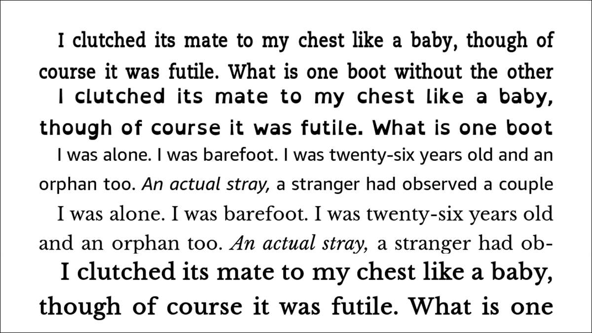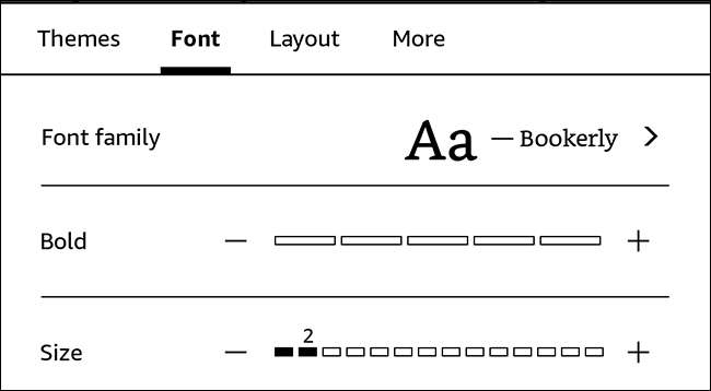 - Font ailesi Yazı tipini kontrol eder. Amazon Ember, Baskerville, Bookerly, Caecilia, Caecilia Yoğunlaştırılmış, Futura, Helvetica, OpenDyslexic ve Palatino arasında seçim yapabilirsiniz. Ayrıca Kendi özel yazı tiplerinizi ekleyin .
