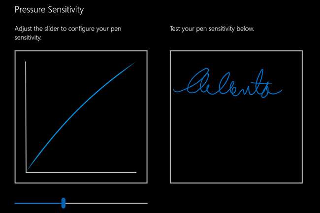 Yüzey uygulamasını açın ve sol taraftaki sütundaki kalem simgesine dokunun. Burada, kalem ucunun basınç hassasiyetini ayarlayabilirsiniz. "Basınç" bir yanlış isimlendirmedir - sonuçta hepsi dijitaldir - ve gerçekte olan şey, Yüzeyin uç mekanizmasına daha sert veya daha yumuşak bir itişi nasıl yorumladığına ilişkin bir ayarlamadır.