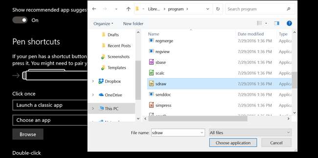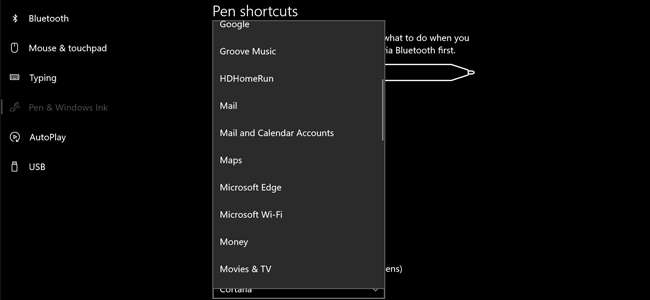 Bu, Surface kalemindeki "silgi" düğmesini kullanarak üç adede kadar uygulamayı başlatmanıza izin veren gerçekten zarif bir özelliktir. Tek dokunuş, hızlı çift dokunma veya dokunup basılı tutma için ayrı bir uygulama başlatabilirsiniz. Windows Ink Çalışma Alanı ve OneNote burada kendi menü öğelerini alır, ancak eylemi herhangi bir dosyaya veya programa bağlayabilirsiniz: