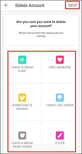 Aynı "Hesabı Sil" sayfasında, Tinder uygulamasından ayrıldığınızın nedenini soracaktır. Bu soruyu cevaplamak istemiyorsanız, sayfanın sağ üst köşesinden "Atla" seçeneğini seçin.