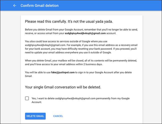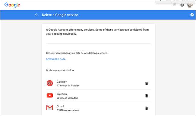 İlk seçenek, Gmail dahil belirli hizmetleri silmenizi sağlar. Bunu kullanın ve e-posta adresinizle birlikte tüm e-postalarınızı silebilir, ancak Google hesabınızın geri kalanını çalışır durumda bırakabilirsiniz. İkinci seçenek, YouTube ve Google Drive dahil Google hesabınızın yaptığı her şeyi ve bu hizmetlere yüklediğiniz tüm belgeleri siler.