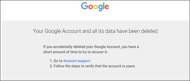 Google, hesap yanı tüm olarak veri, silinmiş olduğunu söyleyen bir sayfa görüntüler.
