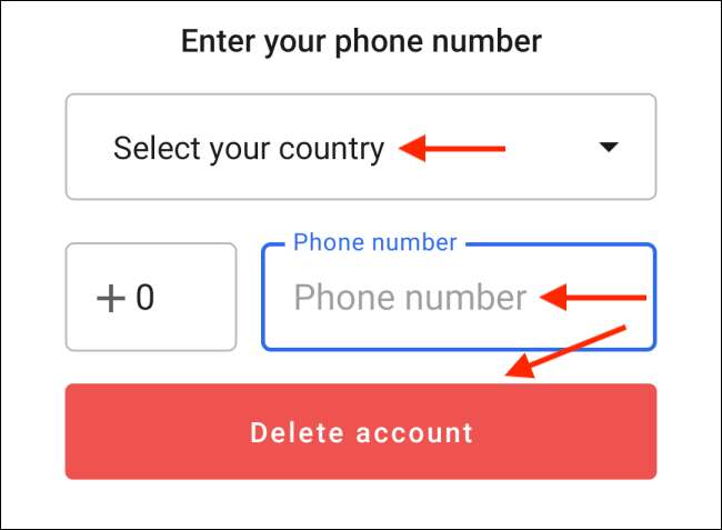 Burada, telefon numaranızı girerek ve ülkenizi seçerek hesabınızı onaylamanız gerekir. Son olarak, "Hesabı Sil" düğmesine dokunun.