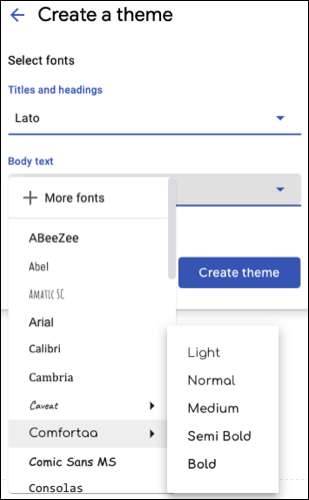 Vücut metniyle birlikte başlıklar ve başlıklar için fontları seçin. Her stilin önizlemelerini görmek için, ışık veya kalın gibi varyasyonları görmek için fontların açılır listelerini kullanın. Ayrıca listenin üstündeki "Daha Fazla Fontları" yi tıklayabilirsiniz. Google'ın daha büyük yazı tipi stilleri seçimi . "Tema Oluştur" ı tıklayın.