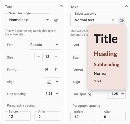 Metin stillerinden herhangi birinde değişiklik yaptıktan sonra, seçimlerinizin nasıl göründüğünü görmek için göz simgesini tıklatın.