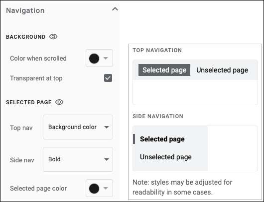 Ardından, bir sayfa seçildiğinde üst veya yan gezinti görünümünü seçebilirsiniz. Kalın veya altı çizili, ön plan veya arka plan rengi veya yanındaki bir çizgi gibi seçenekler arasından seçim yapabilirsiniz. Yukarıdaki bölümler gibi, bir önizleme için göz simgesini tıklatın.